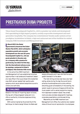Tokyo-based Kasumigaseki Capital Co., Ltd is a premier real estate and development firm specializing in high-impact projects, socially responsible development and nextgeneration hospitality. The company has commissioned Yamaha audio systems at two prestigious installations in Dubai, a high end restaurant and office facilities for related company KME Investment and Management LLC.