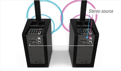Zwei STAGEPAS 1K können per Link-Anschluss miteinander verbunden werden, um den Abdeckungsbereich und die Ausgangsleistung an größere Auftrittsmöglichkeiten anzupassen. Sowohl Stereo- als auch Mono-Wiedergabe sind möglich. Weiterhin lassen sich auch bei verbundenen STAGEPAS 1K immer noch alle Eingänge beider Systeme nutzen (bis zu 6 Mono-Eingänge und 2 Stereo-Eingänge).